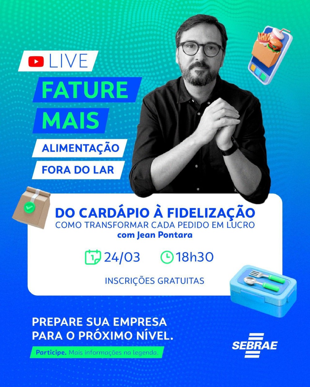 O SEBRAE-SP te convida para a nova edição do Fature Mais para Alimentação Fora do Lar, com uma palestra 100% focada em aumentar o faturamento do seu negócio de alimentação!